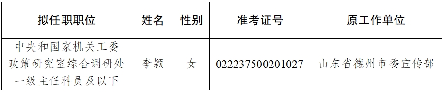 根據(jù)2025年度中央機(jī)關(guān)公開遴選工作有關(guān)要求,經(jīng)過筆試、面試、體檢和考察等程序,經(jīng)研究,確定李穎同志為中央和國(guó)家機(jī)關(guān)工委公開遴選公務(wù)員擬任職人員,現(xiàn)予以公示。公示期間如有問題,請(qǐng)向中央和國(guó)家機(jī)關(guān)工委組織部反映。