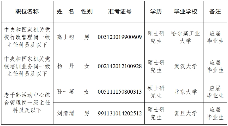 根據(jù)2025年度中央機(jī)關(guān)及其直屬機(jī)構(gòu)考試補(bǔ)充錄用公務(wù)員工作有關(guān)要求,經(jīng)過面試、體檢和考察等程序,擬錄用高士鈞等4人為中央和國家機(jī)關(guān)工委參公單位工作人員,現(xiàn)予以公示。公示期間如有問題,請向中央和國家機(jī)關(guān)工委組織部反映。